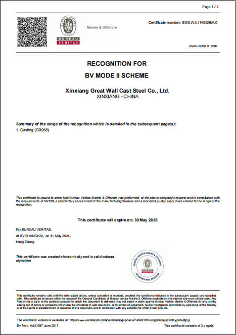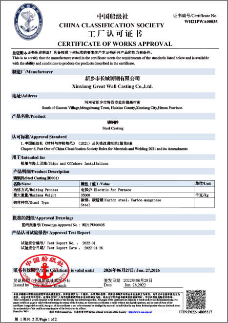 新鄉(xiāng)長城鑄鋼可定制單重150t以下ZG35CrMo、ZG42CrMo等各類碳鋼、合金鋼材質(zhì)的船用鑄鋼件,質(zhì)量UT滿足EN12680.1-1或GB/T7233-2009的2級要求;MT滿足GB/T9444-2016的1級要求,并且獲得CCS/DNV/ABS/NK等多家船級社相關(guān)資質(zhì)認(rèn)證,產(chǎn)品質(zhì)量穩(wěn)定、可靠,已為國內(nèi)多家船廠及配套企業(yè)提供鑄鋼件。
