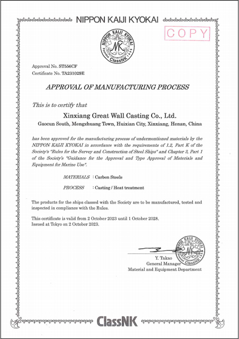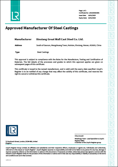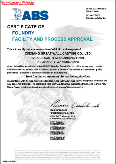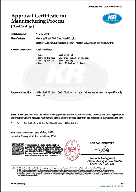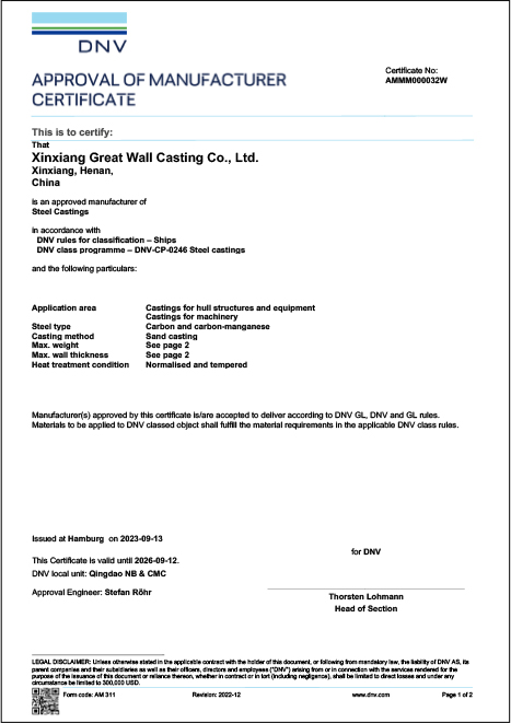 新鄉(xiāng)長城鑄鋼可定制單重150t以下ZG35CrMo、ZG42CrMo等各類碳鋼、合金鋼材質(zhì)的船用鑄鋼件,質(zhì)量UT滿足EN12680.1-1或GB/T7233-2009的2級要求;MT滿足GB/T9444-2016的1級要求,并且獲得CCS/DNV/ABS/NK等多家船級社相關(guān)資質(zhì)認(rèn)證,產(chǎn)品質(zhì)量穩(wěn)定、可靠,已為國內(nèi)多家船廠及配套企業(yè)提供鑄鋼件。
